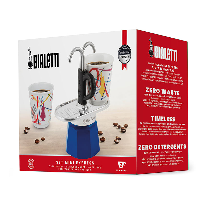 Enjoy coffee and art in one. This limited-edition Mini Express celebrates Kandinsky’s iconic abstract style, featuring two matching espresso cups that sit directly on the moka’s warming plate. Brews 2 cups of authentic Italian espresso and pours them straight into the cups for a unique, stylish coffee experience.