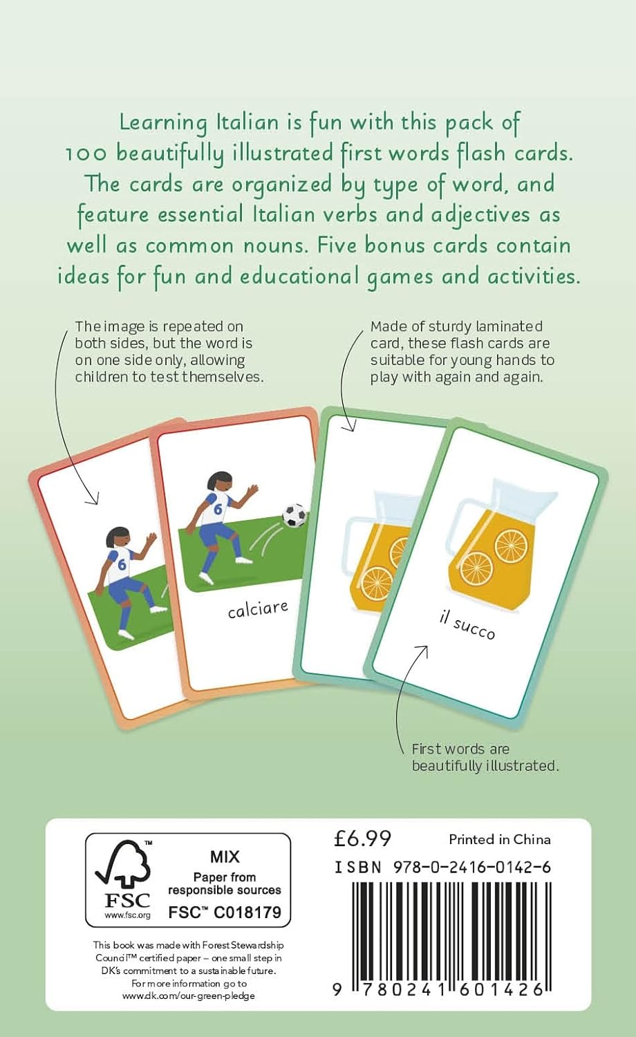 Italian for Everyone Junior Flash Cards are designed for children learning to read and speak Italian. Each beautifully illustrated card features an image and an essential first word. The reverse of the card shows just the image, allowing children to test their knowledge.